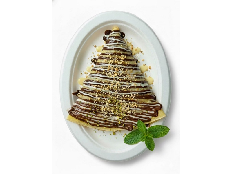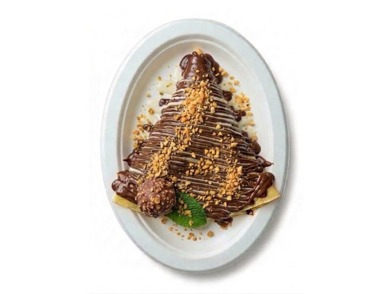 Начинка: Нутелла, Банан, Сгущёнка, Молочный шоколадный топпинг. Украшение: Арахис, Посыпка сахарная, Мята.