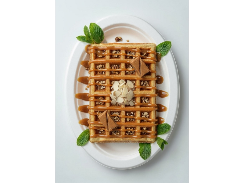 Украшение: Карамельный сироп, Сгущёнка, Конфета, Миндальные хлопья, Мята, Сахарная пудра.