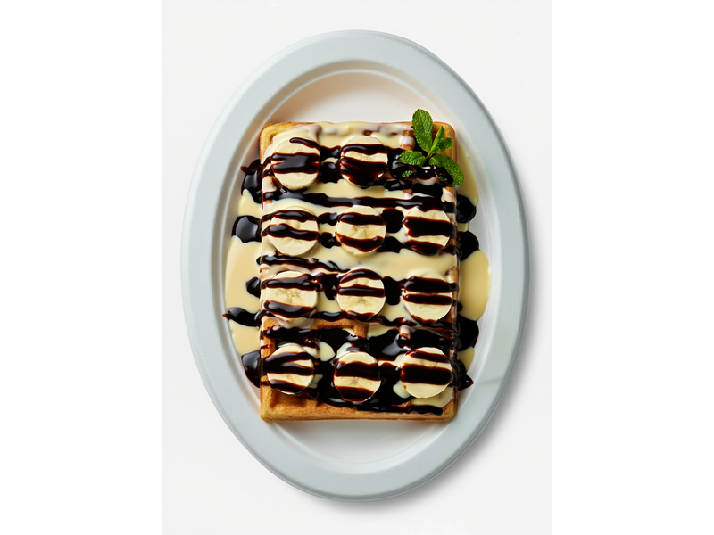 Начинка: Шоколадное мороженое, Банан - Украшение: Молочный шоколадный топпинг, Сгущёнка, Драже