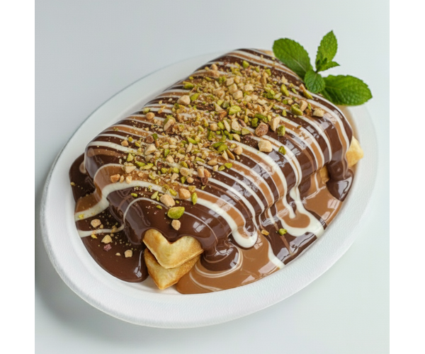 Паста Халва,Паста Дубай,Нутелла,Банан. Украшение: Сгущёнка,Топпинг Молочный Шоколад,Солёная Карамель, Фисташка Очищенная, Мята.