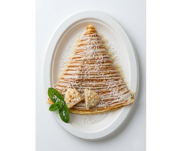 Начинка: Халва, Молоко. Украшение: Соус карамельный, Сгущёнка, Молочный шоколадный топпинг, Миндальные хлопья, Мята.