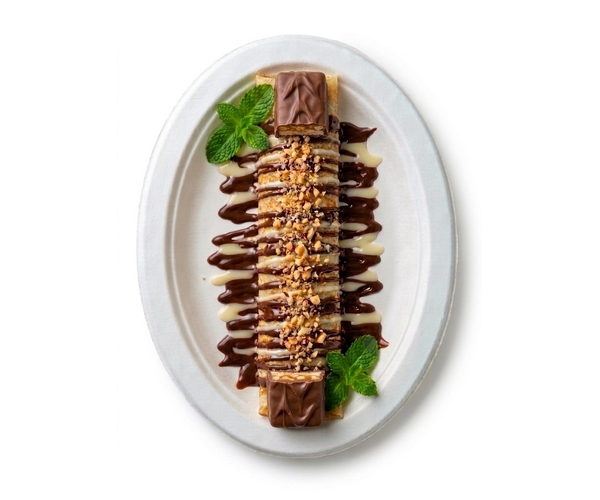 Начинка: Халва, Молоко. Украшение: Соус карамельный, Сгущёнка, Молочный шоколадный топпинг, Миндальные хлопья, Мята.